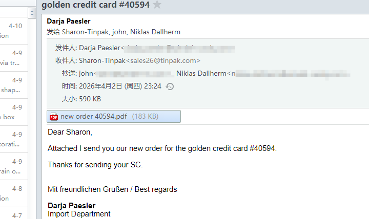We are proud to share a recent email from one of our valued customers, Darja Paesler of the Import Department. Without lengthy negotiations or repeated samples, they simply sent over their new order – Golden Credit Card #40594 – directly to our team.