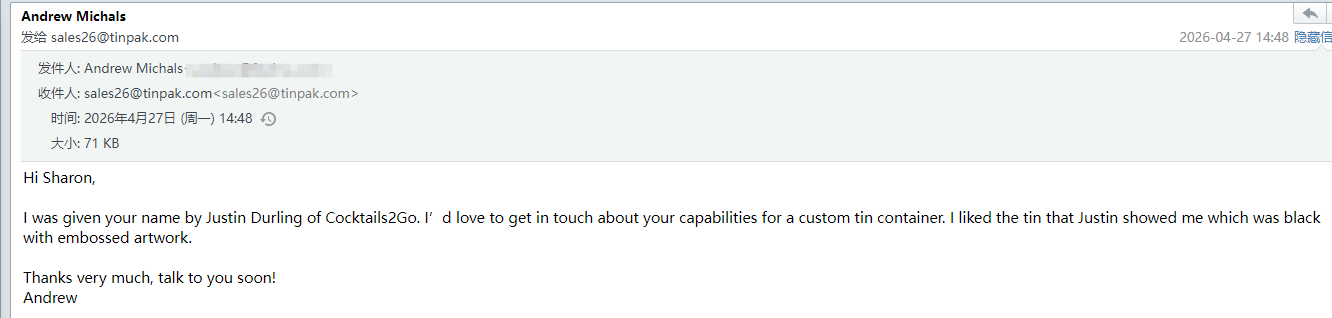 We’re proud when our long-term partners, like Justin from Cocktails2Go, recommend us to new clients. Recently, Justin introduced a new customer to Tinpak for a custom tin container – a great example of how trust and quality lead to lasting business relationships. Our clients know we deliver reliable, high-quality custom tins with professional service behind every order.