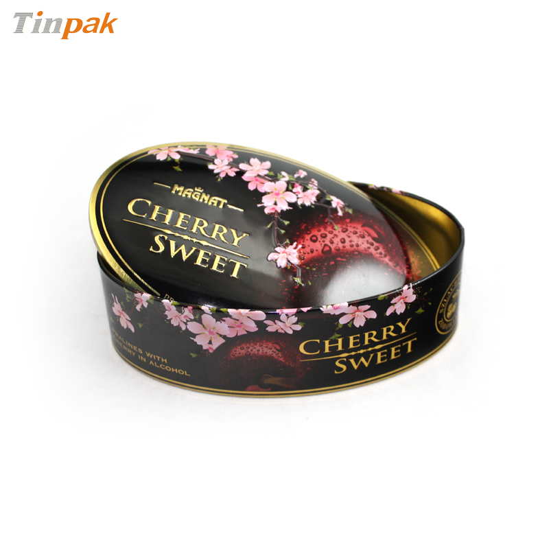 Cherry sweet is a oval shape tin box with size 180x112x60mm( 7x4.4x2.36") for chocolate packing. It is with 3D emboss on its dome lid.