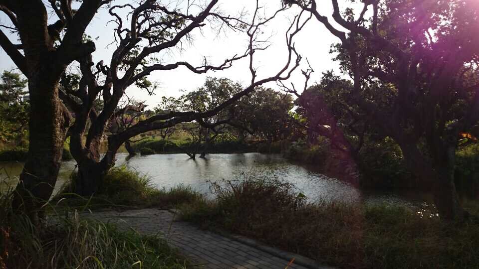 Led by the guider, all of us were very happy, singing, joking and made some games. After about one hour's driving, we arrived in our first destination-Crane's Island Wetland Park. The Crane's Island loacted in Zengcheng district (the east part )of Guangzhou city, and its name origins from that many cranes like to fly to the island for foraging and collect here. Water here is clear and some trees here are still green although it is winter now.