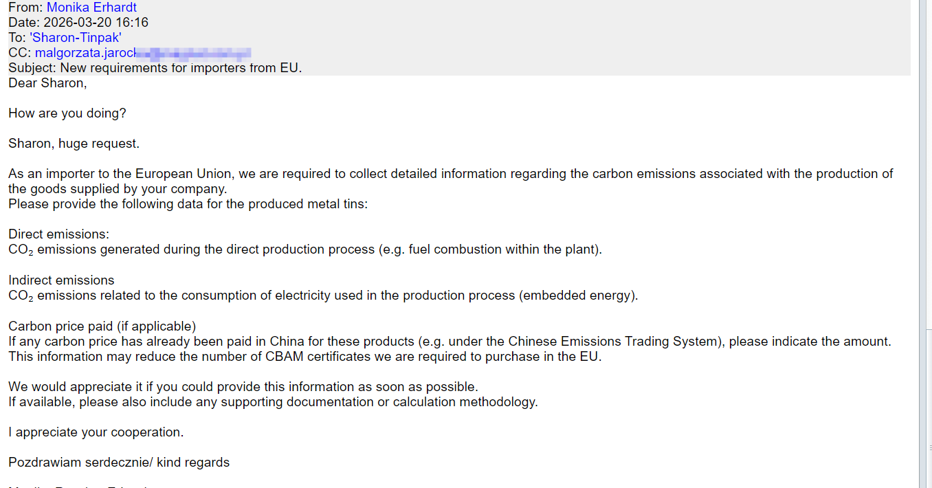 Following an inquiry from Polish client Monika Erhardt regarding carbon emissions data for metal tins exported to the European Union, Tinpak responded swiftly and professionally.