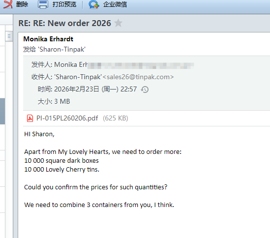 We are thrilled to share another exciting milestone in our ongoing partnership with Monika Erhardt! Following the recent order of My Lovely tins Hearts, Monika has placed another order—this time for 10,000 dark square chocolate tins boxes and 10,000 Lovely Cherry tins.