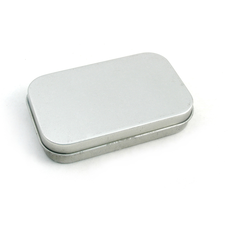 The sandblasted tinplate make the tins matalic look noble even without the print.It can product quickly to meet our client who has a tight schedule for the new project.This small silver tins has 2 pieces structures,we have several size tins like this ,the smallest tin size is 75x50x20mm(other size is 80x50x15mm,93x57x20mm,100x59x20mm,etc).There have two kinds of the lid,one with hinges ,and one is slip lid; the slip lid tin has a round friction dot on the lid and body to hold it tight.The smooth roll line of this tin protect your hands from hurt,body line was curl inward.The lid line is curl outward with a good match of the friction,not only make it open easier,but also hear a clear sweet voice when you open it.