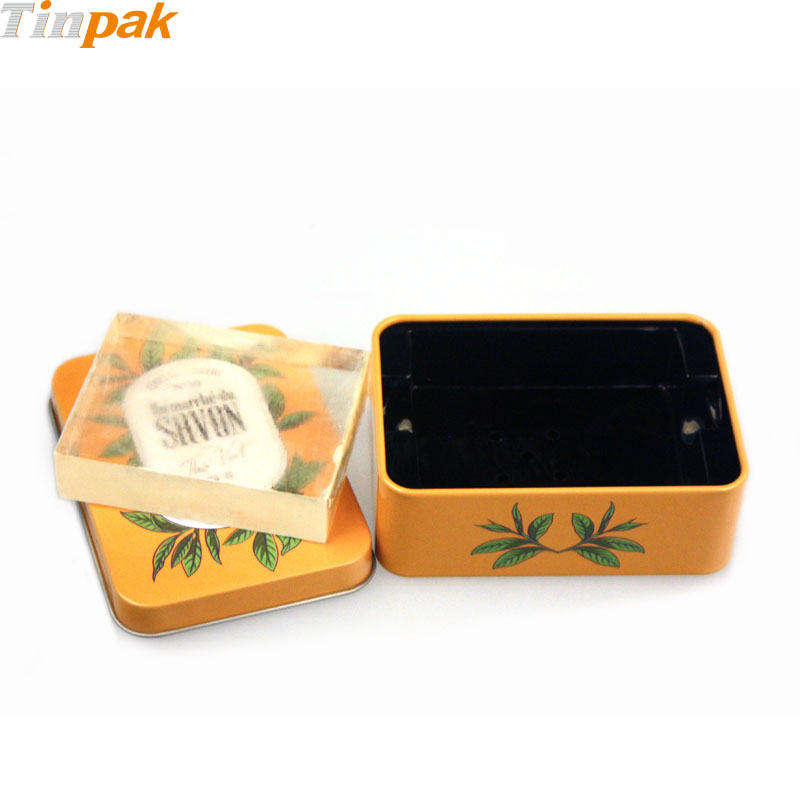 This custom metal cosmetic container is made up of three pieces of upscale tinplate. The aprroved food-safe protective lacquer make the tin possible to store any products, such as candy, biscuit. It has traditional curl-outward lid and curl-outward bottom. The vintage metal soap tins are designed with tray inside to keep your soaps be tidy and from broken.
